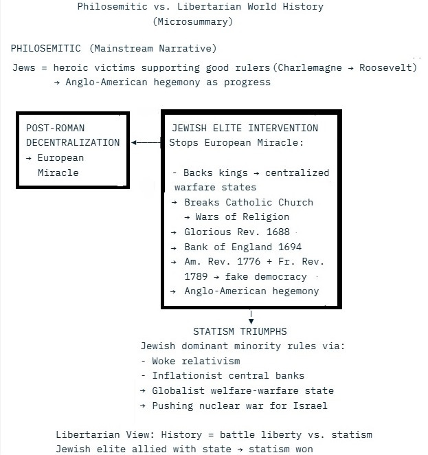 From a libertarian perspective, the narrative of world history is precisely the opposite to philosemitic one. After the fall of the Roman Empire, competing jurisdictions fostered the European Miracle of freedom and prosperity. Unfortunately, the Jewish elite halted this decentralizing process by financially, organizationally and personally supporting many kings against the more decentralist aristocrats, emperors and the Pope, giving birth to the first medieval centralized warfare states with standing armies.
